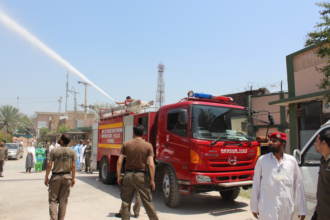 Mr. Khalil ur Rehman Lead fire Instructor at Rescue 1122, practically demonstrated firefighting skills using fire truck in Peshawar Medical College ground.
